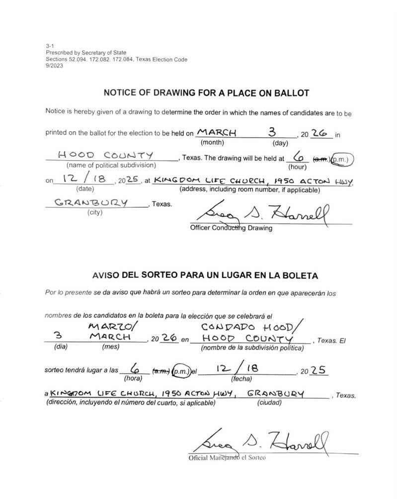 NOTICE: SOS Form 3-1, Ballot Draw Notice for 2026 Rep Primary Election